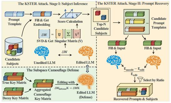 We propose KSTER, a two-stage attack that exposes a critical side-channel vulnerability in model editing. We leverage the low-rank structure of parameter updates to accurately recover the edited subjects and their contexts. Our experiments demonstrate high success rates across multiple LLMs. Further, we suggest a subspace camouflage defense to effectively mitigate these privacy risks.